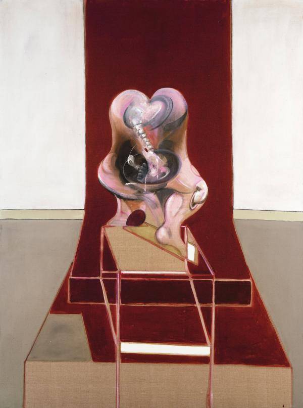 从这一阶段起,培根逐渐形成了一种独特的视觉语言特点:孤立的人物往往被置于几乎抽象的几何框架中,肢体和面部特征被扭曲、拉伸,背景简化如同无垠的心理空间。他的颜色运用也极具戏剧性,往往以肉色、深紫、黑色等强烈对比来增强情绪冲击力,这种视觉策略不仅呈现出身体的物质性,也暗示出情感张力。
