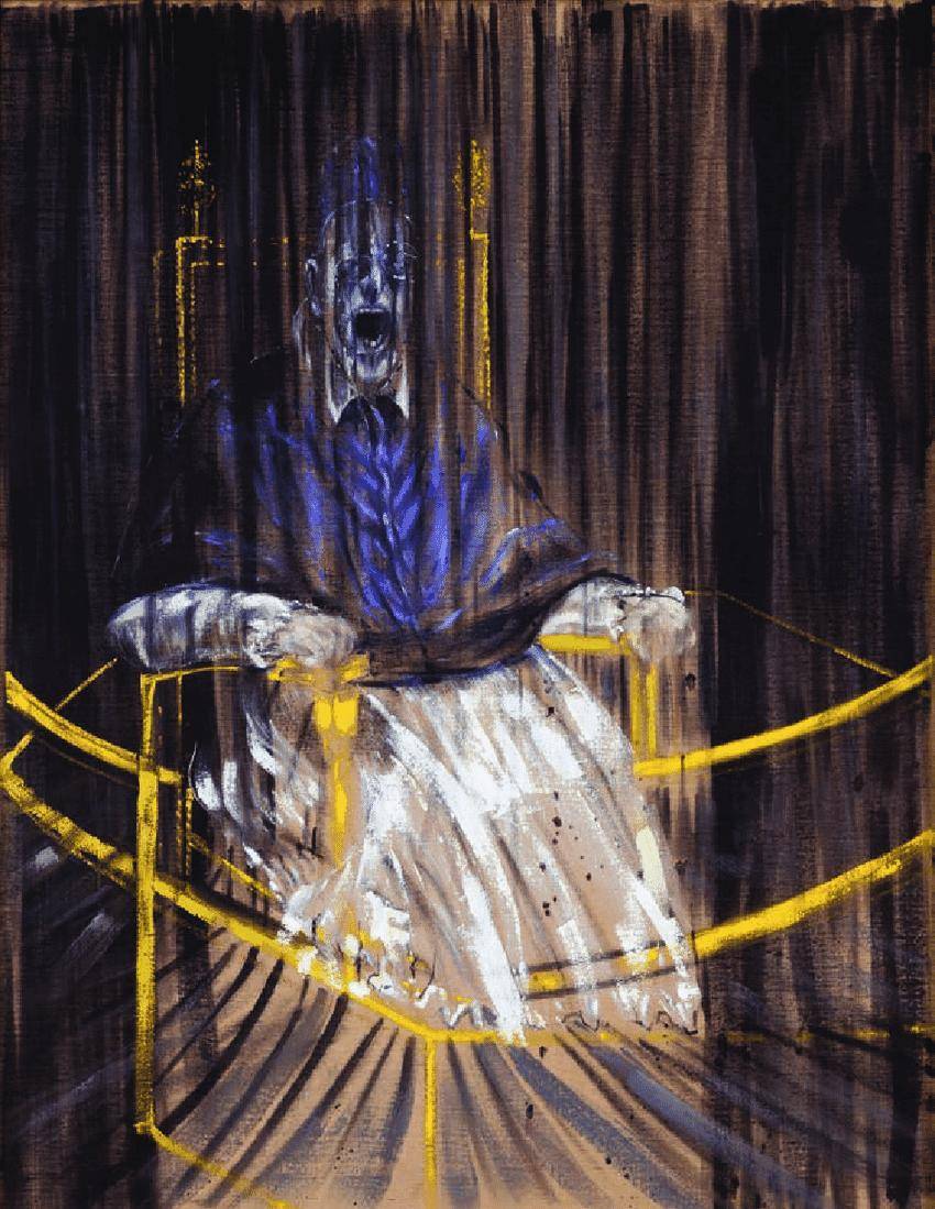 1940年代末至1950年代中期,培根进入更成熟的阶段。他最著名的系列之一便是所谓的“尖叫教皇”系列(The Screaming Popes)。这一系列基于委拉斯开兹(Diego Velázquez)经典肖像《教皇英诺森十世像》,但培根并不是简单地再现,而是通过扭曲和放大色彩,把教皇的形象转向一种存在主义噩梦——在他的笔下,这个权力象征被剥离了神圣光环,成为孤独、呐喊、痛苦的象征。