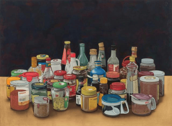 《我的莫兰迪》和《我的莫兰迪2》回归至物件本身。在日常里发现的艺术,本身承载着更多人文赋予的意义,陈飞的瓶罐和莫兰迪的瓶罐都是生活必需品,反映了当下中国的两种不同阶级的日常。莫兰迪的锥柱台瓶,是他精神的食粮;陈飞的油盐酱醋和茅台,不仅是身体的食物,更是他身上烟火气和才气的结合。