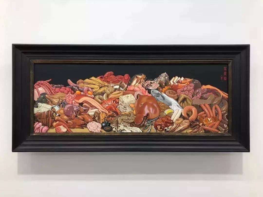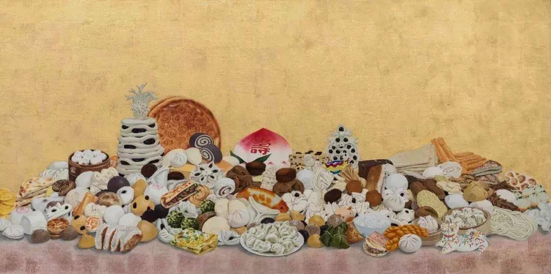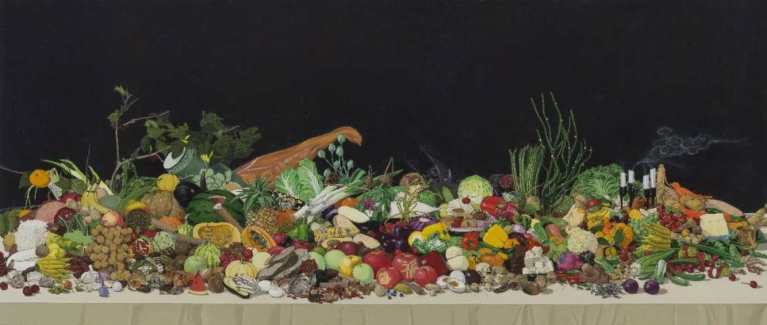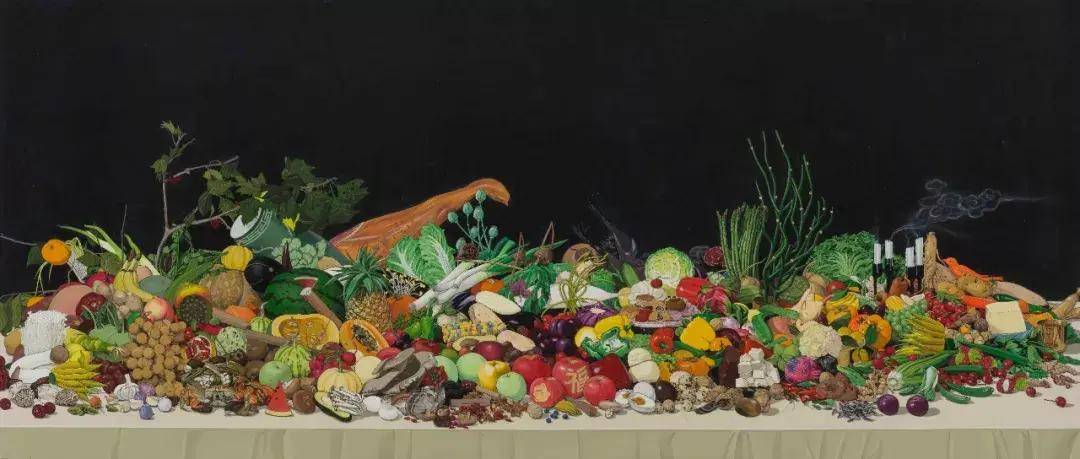 在艺:《太平图》这件作品中,丰富的食物充斥整幅画面,一派太平盛世象。但是画风与您之前完全不同,我相信您肯定不仅仅只是想表现一种太平或者美好的景象,这里面有些什么其它的隐喻吗?