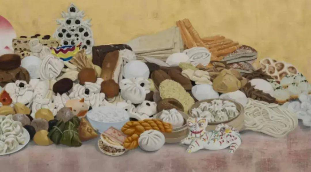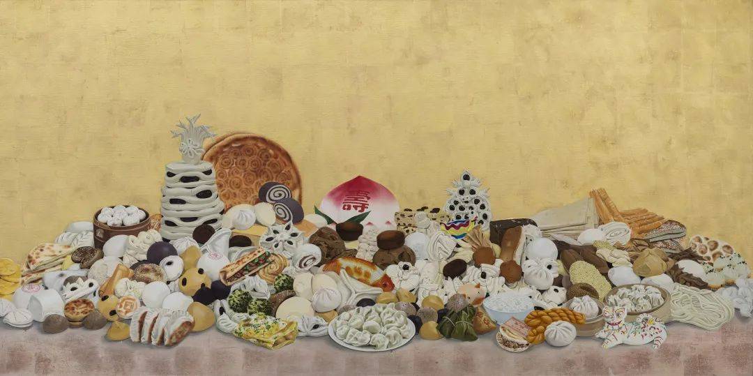 那么对我来说,作品中附加的文本信息反而需要更多,你刚才说的那一层含义在我创作之前一定都会考虑到的,这里面会有这些因素。我可能还没有能安分到这一件作品真的是纯粹的就画一张静物而已,它其实像一个暗流,在这个静物的表现下面还是会有一些汹涌的波动。比如《太平图》中的这些都是主食,是高碳水,最后转化的是糖,会刺激人的多巴胺,引起人的兴奋,其实就是膨胀、欲望。所以我更多的希望是这么具象的一张绘画,能够让更多的人去找到他不同的阅读和理解的方式。