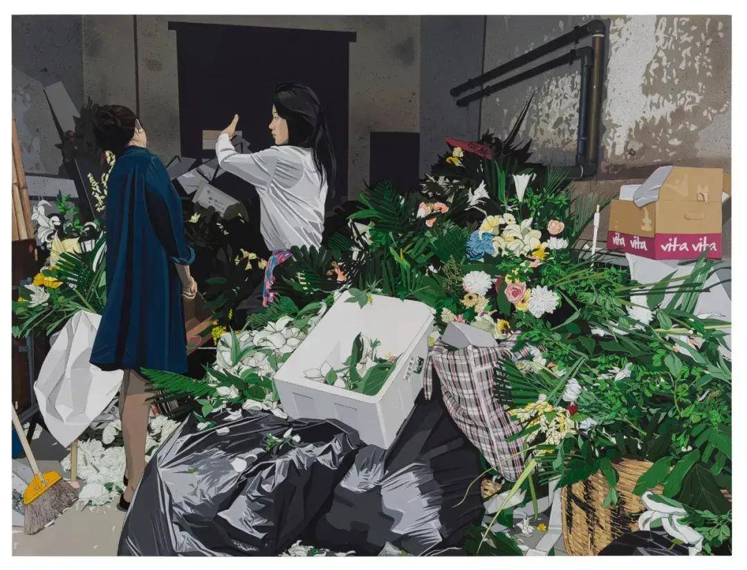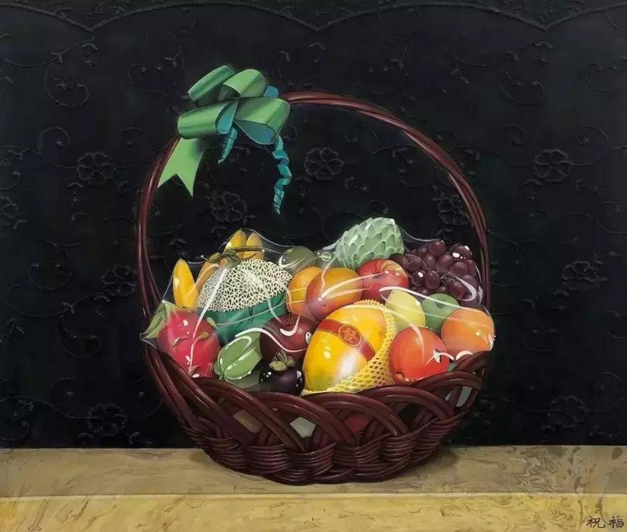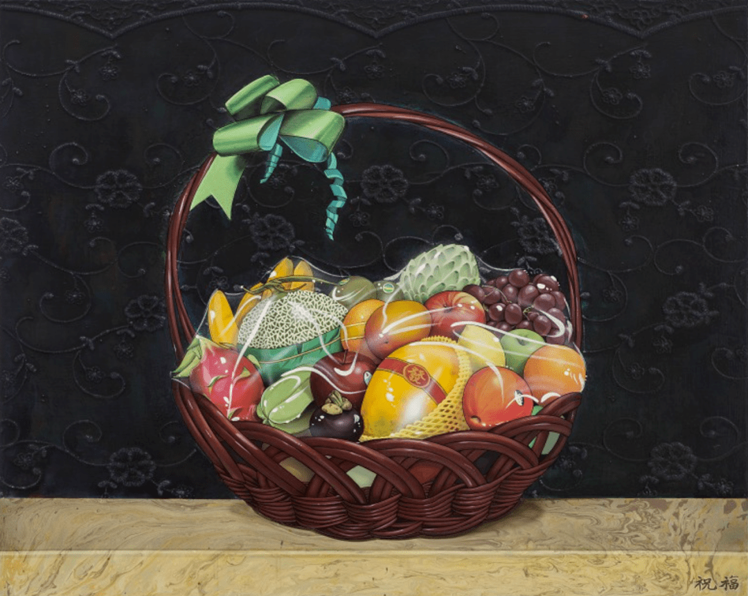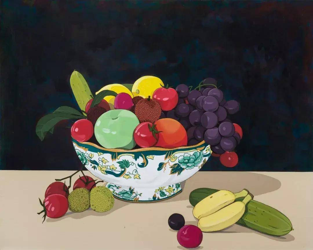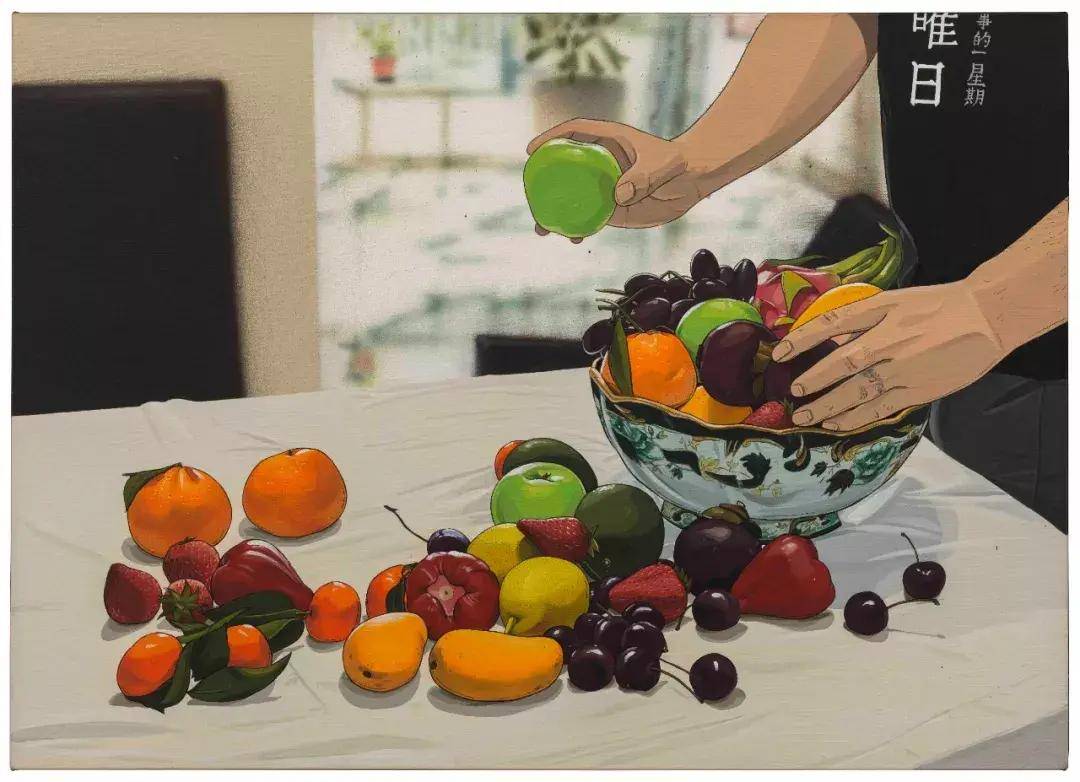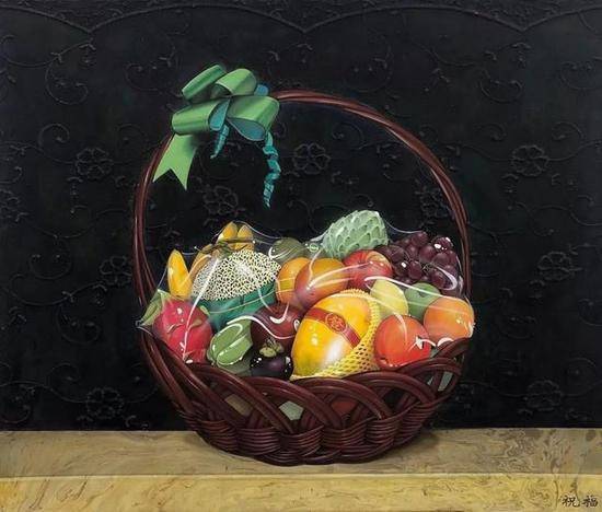 《祝福》遥呼卡拉瓦乔(Caravaggio)的《水果篮》(1599),《好自为之》对应杨·戴维茨·德·希姆(Jan Davidsz。 de Heem)的《瓶花》(1660),各自回归静物画里细分的种类。在陈飞的果篮里,戏剧性的加上了一层保鲜膜。不同于扁平化的其他内容,果篮里的水果,肉质被无限充盈,果皮着色被调至超出常规的饱和,在此,陈飞借鉴了中国乡村的风俗年画。陈飞画里的东方元素,不止闪烁着《中庸》和“形而上”,艺术家更有勇气把“烟火”和“江湖”这些更“中原”的概念展示在作品里。