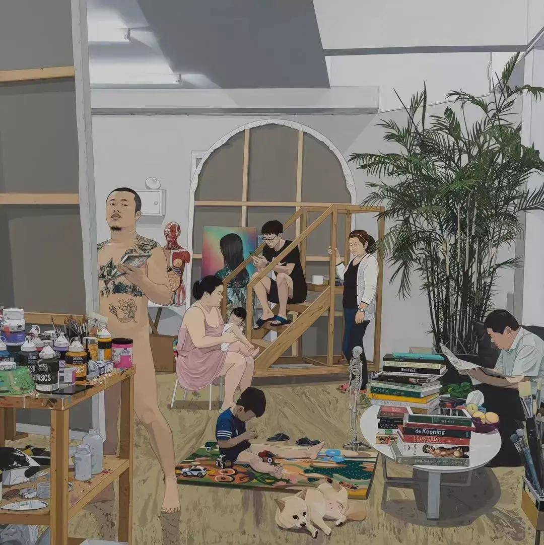 陈飞,画家和家庭,2018,亚麻布、丙烯。 290 x 290 cm